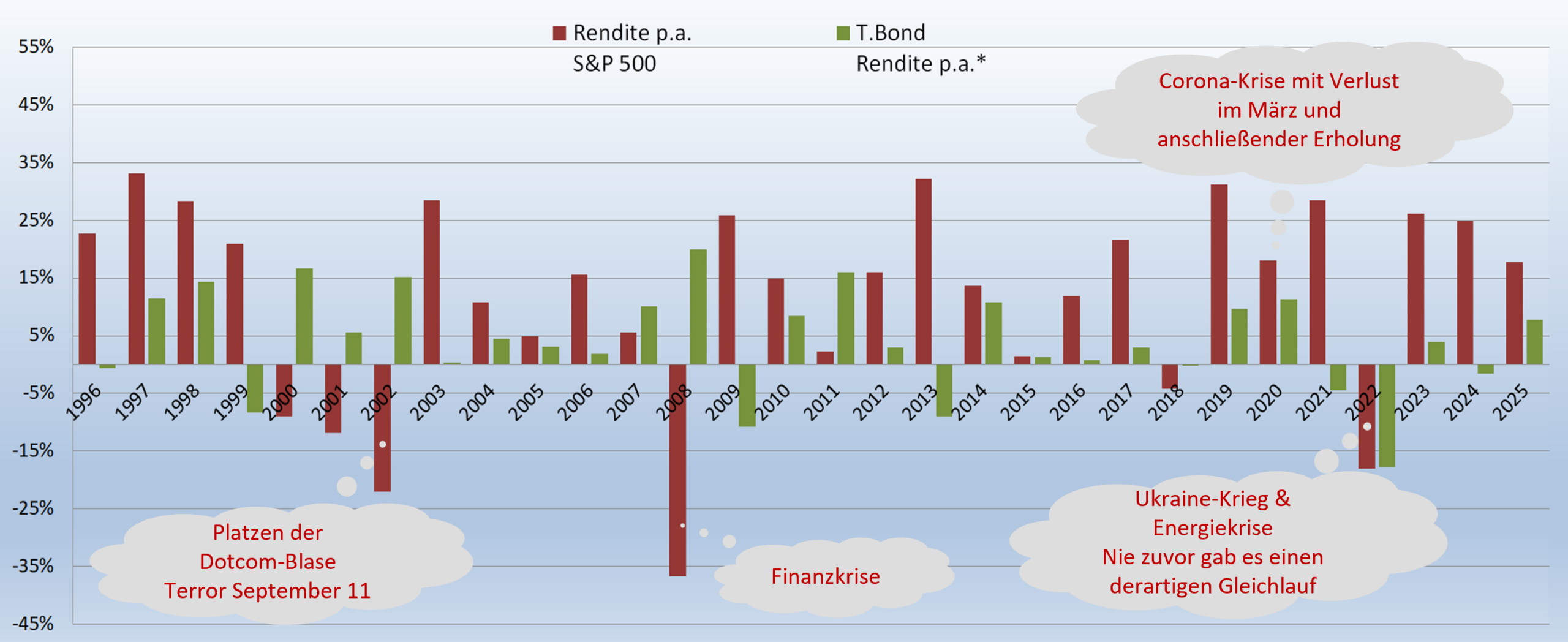 Zudem ist die Spannbreite der jährlichen Renditen im Betrachtungszeitraum erheblich – Minimum 1927 bis 2025… S&P 500: -43,8% (1931) T-Bonds: – 17,7% (2023) – Maximum 1927 bis 2025… S&P 500: +52,6% (1954) T-Bonds: +35,9% (1982)
